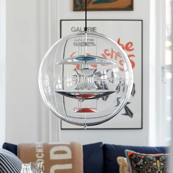 Verner Panton hat in den sechziger und siebziger Jahren des vergangenen Jahrhunderts eine Leuchtenfamilie geschaffen, die eine Reihe von kugelförmigen Pendelleuchten umfasst, die alle nach einem ähnlichen Prinzip aufgebaut sind. Die äußere Hülle besteht aus einer transparenten Acrylkugel, die den Blick auf das Innenleben der Leuchte freigibt. Dort befindet sich ein System aus Reflektoren. Bei VP Globe, einem der Modelle aus dieser Leuchtenfamilie, sind es insgesamt fünf Aluminiumreflektoren in Weiß, Blau und Orange, die für die Lenkung des Lichts verantwortlich sind. Sie sind so angeordnet, dass das Licht hauptsächlich zu den Seiten entweicht und weniger nach oben oder unten. Deshalb eignet sich die Pendelleuchte besonders gut als Raumlichtspender.