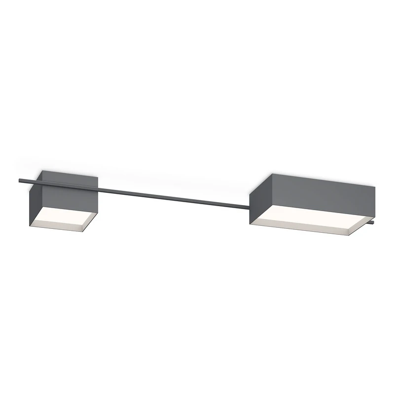 Bei der Deckenleuchte Structural 2462 sind zwei Aluminiumschirme in kubischer Form durch einen schlanken Metallstab miteinander verbunden. Dadurch wirkt es wie Lichtpunkte, die frei unter der Zimmerdecke schweben. Die rechteckigen Boxen haben verschiedene Maße und Höhen, was ihnen ein asymmetrisches Aussehen verleiht. Ein Diffusor aus Polycarbonat, der nahezu immateriell wirkt, blendet das Licht der fest verbauten LEDs ab und sorgt so für eine weiche, jedoch gezielte Lichtverteilung.