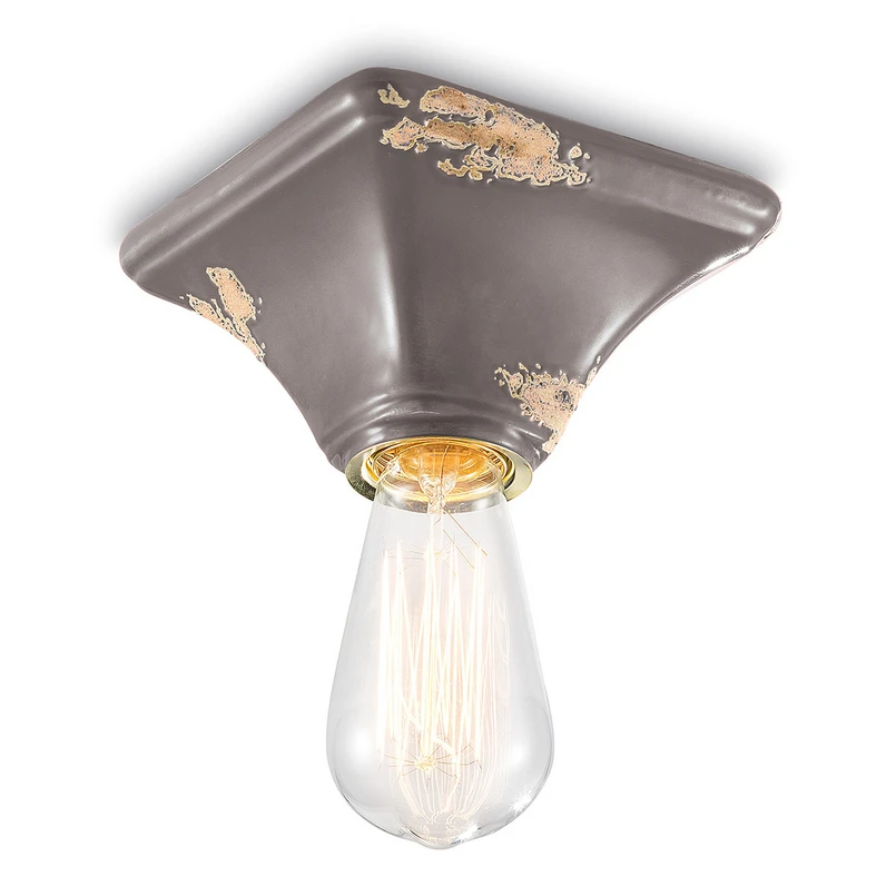 Die Deckenleuchte C135 ist eine schlicht gestaltete, eckige Leuchte, die fast nur aus einer Lampenfassung besteht. Die keramische Deckenhalterung erinnert durch ihre teils wie abgenutzt erscheinende Oberfläche stark an den urbanen Stil und passt perfekt in das Vintage-Ambiente. Die raffinierte Erinnerung an vergangene Zeiten und die Schlichtheit der Formgebung verleihen C135 einen einzigartigen Charakter. Besonders stilecht kommt die Deckenleuchte zur Geltung, wenn eine Rustika-Lampe mit Filamenttechnik oder mit Kohlefaden-Optik eingesetzt wird.