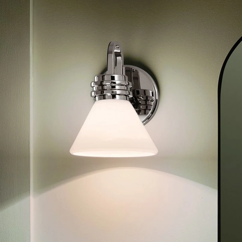 Die Wandleuchte Farum 1 besteht aus einem Gestell aus Stahl und einem opalweißen, kegelförmigen Schirm aus Glas und ist dank Schutzart IP44 perfekt für Badezimmer geeignet, wo sie seitlich von Spiegeln für eine schöne Optik und eine harmonische Beleuchtung sorgt. Die Leuchte mit G9-Fassung wird inklusive LED-Leuchtmittel mit warmweißer Lichtfarbe geliefert, das sich einfach austauschen lässt.