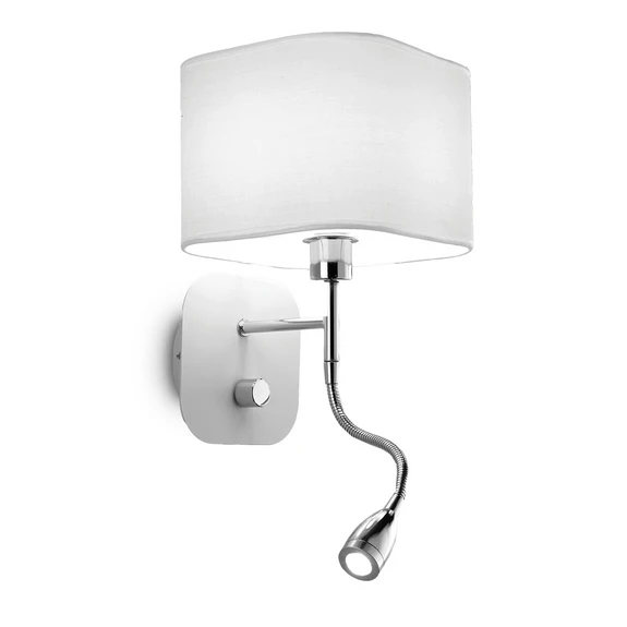 Der untere Arm geht in einen Flexarm über, an dessen Ende ein kleiner, einfacher Leuchtenkopf mit integriertem LED-Leuchtmittel angebracht ist. Auf der Wandhalterung befindet sich ein Schalter, über den beide Lichtquellen unabhängig voneinander zu betätigen sind.