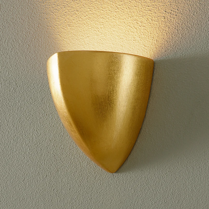 Elegant fügt sich diese halbrunde Leuchte jeder Wand an und sorgt für eine effektvolle Akzentbeleuchtung. Sie wirkt überaus elegant und sorgt durch das edle Blattgold auch in ausgeschaltetem Zustand für besonderen Glanz.