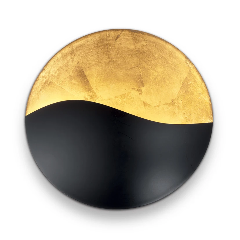 Die Wandleuchte Sunrise hat ihren Namen wirklich verdient. Basierend auf einer runden Grundform ist sie in einen unteren, schwarzen und einen oberen, goldenen Abschnitt geliedert, die geschwungen ineinander übergehen. Hinter dem unteren Element befinden sich G9-Halogenlampen, deren warmes Licht die obere goldene Fläche unterstreicht und zudem die oberhalb gelegene Wand erhellt. Das Ergebnis ist die Szene einer aufgehenden Sonne vor einer noch dunklen Hügellandschaft.