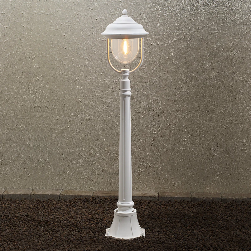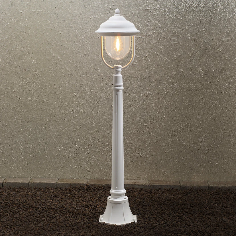 Die Wegeleuchte Parma besitzt klassische Linien und punktet durch ein aus Aluminium bestehendes Grundgerüst. In Verbindung mit dem klaren Leuchtenglas kann ein optimaler Effekt bei der Ausleuchtung erzielt werden. Durch die filigranen Verzierungen, die am Mast sowie der Leuchte zu finden sind, wird eine nostalgische Wirkung erzielt.