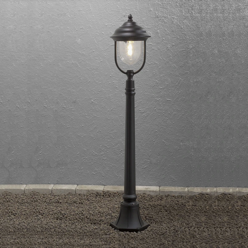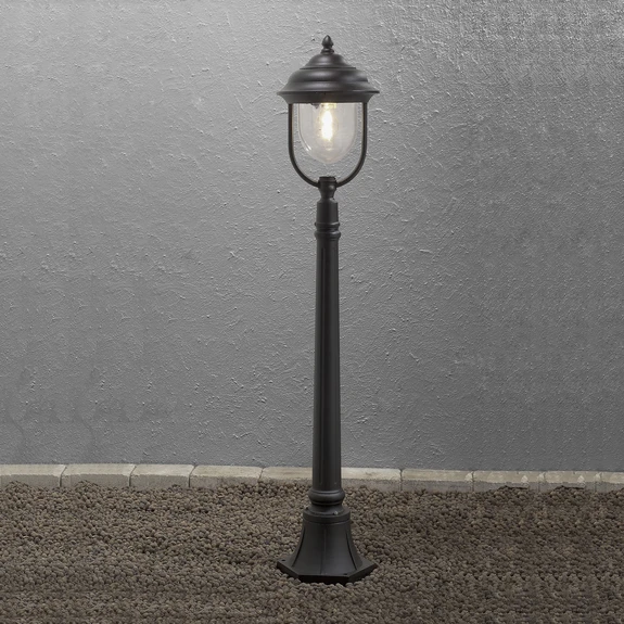 Klassische, aus Aluminium gefertigte Wegeleuchte Parma. Das klare Leuchtenglas garantiert eine optimale Ausleuchtung. Der schön geformte Schirm und die Verzierungen an Leuchte und Mast verleihen der Leuchte eine leicht nostalgische Wirkung.