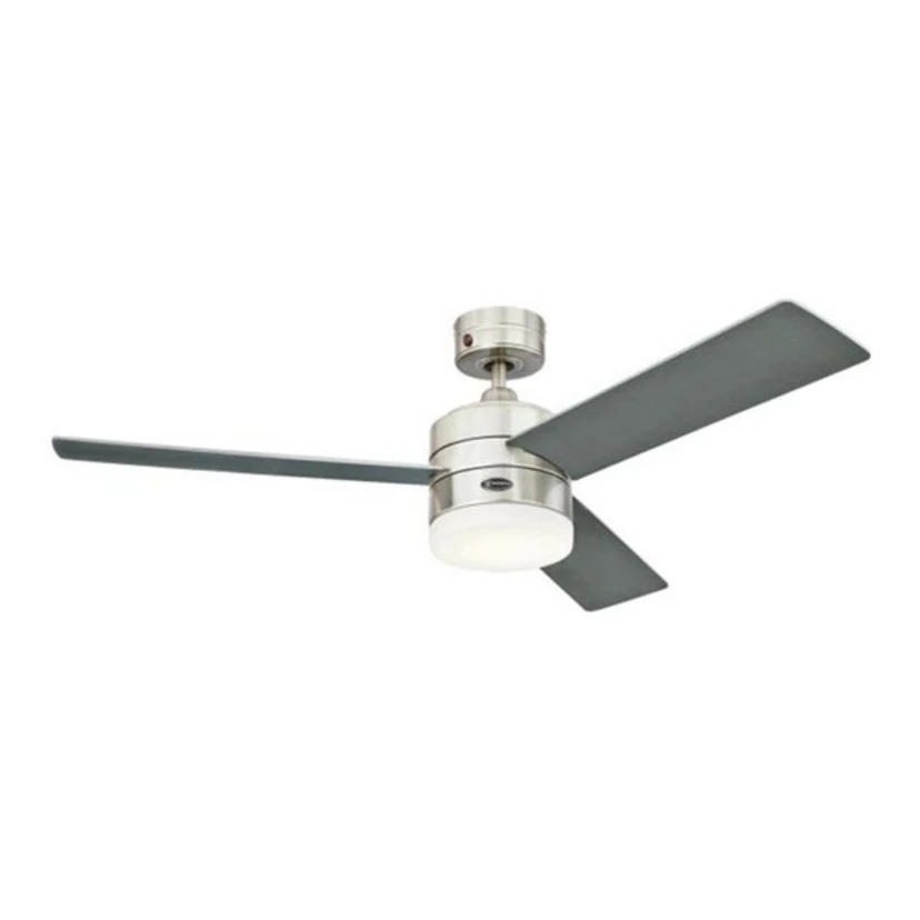 Klar und strukturiert wirkt das Design des Deckenventilators Alta Vista mit Edelstahl-Gehäuse und zweifarbigen Flügeln. Eine Seite zeigt sich in der Farbe Grafit, die andere Flügelseite ist in einem hellen Ahornton gehalten. Die mittig angebrachte Glasleuchte ist mit einem energieeffizienten, dimmbaren LED-Leuchtmittel bestückt. Eine Fernbedienung für die komfortable Bedienung wird mitgeliefert.