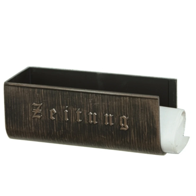 Der Zeitungshalter 805 greift einen traditionellen Stil wieder auf. Er ist aluminiumgussgefertigt und in einer schlichten Röhrenform gestaltet, die nach oben offen ist. So lässt er sich gut unter einen Briefkasten der passenden Serie montieren. Durch die Abdeckung mit dem Briefkasten liegt die Zeitung gut geschützt im Halter. Eine der beiden Seiten ist geschlossen und unterstützt eine trockene Unterbringung bei feuchten Wetterlagen. Der Zeitungshalter trägt den altdeutschen Schriftzug „Zeitung“ und ist mit einer rauen Oberfläche gestaltet. Die zweifarbigen Lackierungen setzen dabei feine dekorative Akzente. Das praktische Utensil für Presseerzeugnisse ist formstabil gebaut und überzeugt durch die robuste und haltbare Qualität. Zum Anbau an der Außenfassade sind alle Montagematerialien in der Lieferung enthalten. Die Herstellung erfolgt durch eine deutsche Traditionsfirma mit Erfahrungen im Metallwarenbau seit rund 150 Jahren.