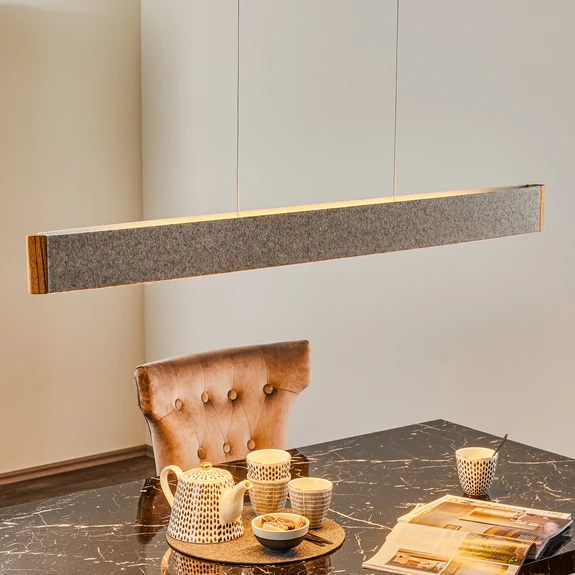 Wer glaubt, dass das Material Filz nur naturbelassen und rau wirken kann, der irrt sich. Der Stoff kann genauso gut edel und elegant wirken. Den Beweis hierfür liefert die LED-Hängeleichte Zep 13. Das Modell schafft es, ein natürliches Material mit einer extrem modernen Form zu verbinden und daraus etwas vollkommen Neues zu erschaffen. Das Ergebnis überzeugt. Zip 13 wirkt klassisch, modern, hochwertig und irgendwie anders. Dennoch passt sie sich perfekt eleganten Einrichtungen an und verleiht diesen eine ganz besondere Note, die herkömmliche Hängeleuchten nicht erzielen würden. Ergänzt wird der Wollfilz übrigens durch Zebrano-Holz. Dieses ebenfalls sehr natürliche und organische Material sorgt dafür, dass die Leuchte besonders ruhig und warm wird. Um dennoch ausgezeichnete Beleuchtungsergebnisse zu erzielen, ist Zep 13 mit modernen LEDs ausgestattet. Diese erreichen 4000 Lumen und sorgen somit dafür, dass die Hängeleuchte als Hauptbeleuchtung eingesetzt werden kann. Das Licht ist sehr warm und damit perfekt für Wohn- und Esszimmer geeignet. Auch moderne Büroräume können mit dieser besonderen Leuchte ausgestattet werden. Damit die Leuchte nicht blendet, ist sie von innen mit Lunopal ausgekleidet. Dieses Material wird auch als Stoff für Lampenschirme verwendet.