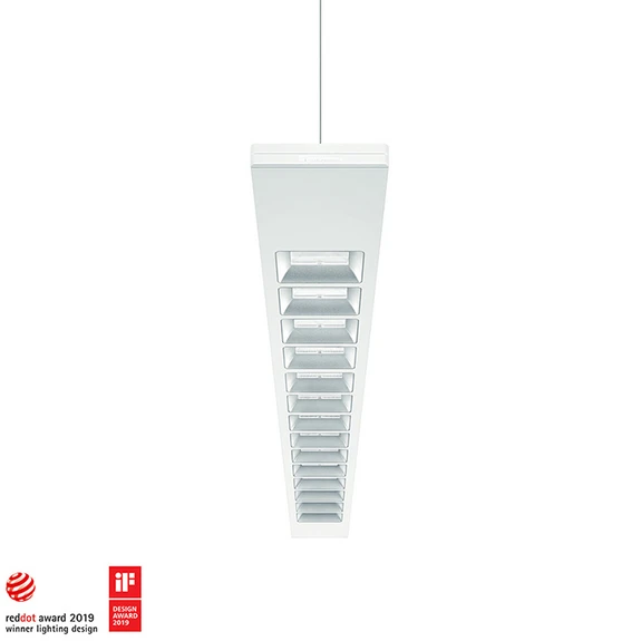 Der Hersteller Zumtobel hat diese Hängeleuchte in minimalistisch-funktionalem Design entworfen. Claris evolution besteht aus einem langen, rechteckigen und flachen Balken, der aus weiß pulverbeschichtetem Aluminium-Strangpressprofil und Stahlblech gefertigt ist. Die LEDs befinden sich auf einer doppelseitigen Lichtleiterplatte. An der Ober- und Unterseite befinden sich Lichtöffnungen mit mattweißen prismatischen Austrittsflächen, sodass ein gleichmäßiges Licht und blendfreie direkte und indirekte Beleuchtung erzielt wird. Deren Helligkeit kann über externe DALI-Dimmer geregelt werden. Claris Evolution wird so zur idealen Büro-Hängeleuchte - auch im Bereich von Bildschirm-Arbeitsplätzen.