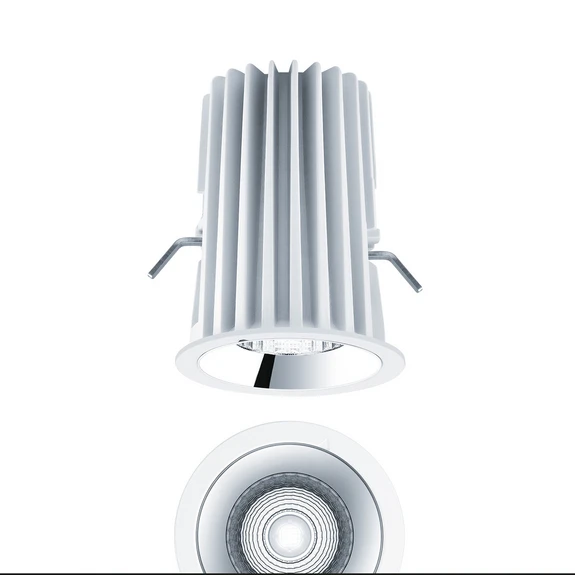 Diese Ausführung der LED-Einbauleuchte Diamo von Zumtobel bietet präzises, streufreies Licht. Gerade in Bereichen, wo eine effektive, gezielte Akzentbeleuchtung mit naturnaher Farbwiedergabe gefragt ist, spielt Diamo ihre Stärken aus. Hierzu ist sie mit einem besonderen Reflektor mit silbern eloxierter, hochglänzender Oberfläche aus Reinstaluminium ausgestattet. Das Gehäuse mit Kühlrippen ist aus Aluminiumdruckguss gefertigt. Vom Raum aus sichtbar sind der Reflektor und ein äußerer weißer Abdeckring.